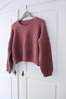 CEFALÙ jumper is knitted bottom up, beginning with knitting the lower body section in rounds. After the underarm area is reached, the front and back sections are worked flat separately. The shoulders are closed using Three Needle Cast Off technique. The sleeves are worked top down in rounds by picking up new stitches at the armhole. The design has a cropped fit and a positive ease of about 25 cm compared to the actual bust circumference.