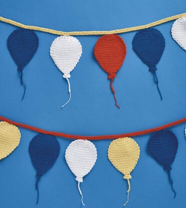 The balloons are made from the top down, the initial 3-ch being the top of the balloon. The bottom loops of these are then used to sew the balloons onto the crocheted ribbon. There is very little weaving in of ends. Leave a longish tail when making the first 3-ch, as this will be used to attach the balloons to the ribbon. The balloons are made in three of the four colours in double crochet. The ribbons that the balloon motifs are attached to are made in the remaining colour.