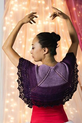 Beginning with a center neck cast on, the shawl features 2 columns of yarn-over increases, plus increases at the edges. The first section is all in garter st, so the knitter will see fast progress. The gradient colors will be graduated with the lightest color at the top, and the darkest at the lower edge. At the lower border, there is a lace design which forms a scalloped edge.