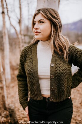 The Celsea Button Up Crochet Cardigan is an oversized cardigan with a slightly shaped front neck opening, tapered sleeves, knit-look ribbing along the bottom hem and cuffs, and a knit-look buttonhole front edging.