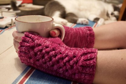 These fingerless mittens were partially inspired by my love of cables and the fact that I grew up in Nova Scotia. There is a lot of Celtic influence in Cape Breton, and you can’t help but have it blend into the rest of the province. I also was part of a Highland Dance group as a child, and loved everything to do with cables and tartans. The cable is only on the back of the hand to make sure that it doesn’t impact the wear of these mittens. I like to have mittens with flat palms to allow me to wear them when knitting or when on the computer.