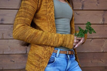 The Celtic Cardigan will be knitted top down in one piece. You start with the celtic border in the neck with a provisonally cast on. Then pick up stitches along one edge. It can be knitted without shaping like the sample or with shaping for the hips. Sample shown in Size S on a 84cm bust.