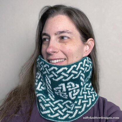Beautiful Celtic knots surround a circular Celtic knot called a shield knot, traditionally used for protection. Celtic knot designs have long been featured in knitted garments and accessories, and this cowl is perfect for warding off the cold with a Celtic flair!