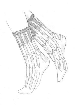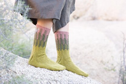 The Cereus Socks were inspired by their namesake, the Cereus Cacti. I was drawn to these strange and alluring plants and their interesting patterns. Chevrons are used to resemble the long and deep natural grooves of this plant, while contrasting textures of Garter stitch and Stockinette stitch are used to mimic the smooth and rough surfaces. The Cereus Socks were originally published in Making No.7, the Desert issue in April of 2019.