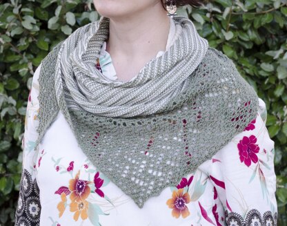 Este chal en forma triangular es muy fácil de tejer y muy cómodo de llevar y además es reversible y en dos colores. Se trabaja desde la parte más estrecha sin calado aumentando progresivamente hasta llegar al borde de encaje. Todo el chal está tejido a punto bobo (punto Santa Clara), incluido el borde final, todas las vueltas se tejen del derecho, lo que hace que el chal sea reversible y luzca igual por sus dos caras.