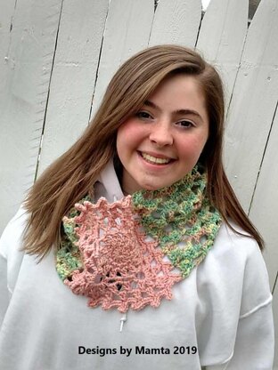 The rest of the cowl has a lacy pattern with skull-like designs. The combination of chamomile and skulls gives it the effect of the light and the darkness within us and tells us to embrace it all. It has a soft, elegant and romantic feel to it. Chamomile Cowl uses a combination of simple stitches like chains, single crochet, bobble stitches and picots which gives it a beautiful lacy look.