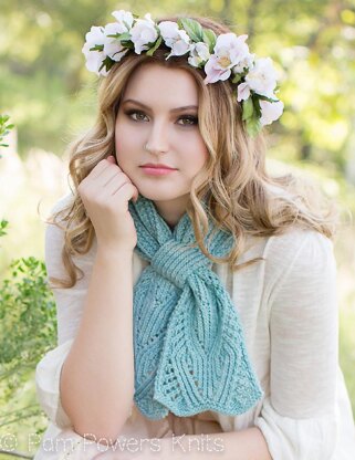 This ascot has an intricate twisted-stitch lace pattern adorning both ends and a pull-through slit, so no tying necessary.