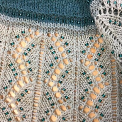 I used Three colors of Queensland Collection "Llama Lace Melange". One skein each of colors 100, 101, and 103I used pretty, pearly 6/0 Miyuki beads in color 421C. Llama lace is soft and buttery. A total joy to use.