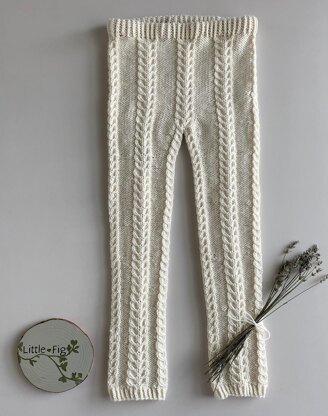 The leggings are worked from the bottom up, in the round, then joined at the crotch. Short rows are worked across the seat to create rise. A deep rib waistband is worked, to be turned over and hemmed, with elastic inserted.