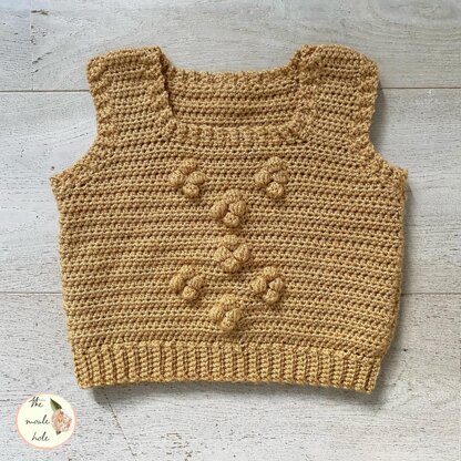 Gender neutral with an amazing fit, the Charlie Vest is a must for your handmade wardrobe. The Charlie Vest is constructed in two flat pieces and then sewn together. The ribbing is stitched to the bottom, sleeves and collar once the the two pieces are attached. Each size has a slightly different bobble motif. This piece could easily be made without the bobbles if you would like a plain vest. If you decide to do this, replace all bobble stitches with half double crochet stitches. Both models wear size 3-4.