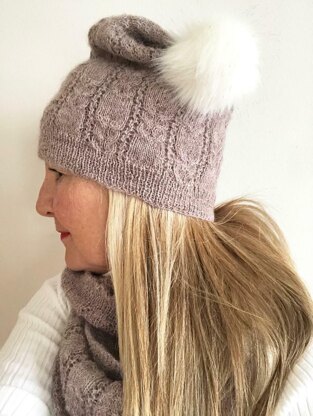 A delicate combination of cables and eyelets wend their way gently across the surface of this softly unstructured set. Stockinette panels are punctuated with simple rhythmic double cables and pierced with rick rack openwork columns. Whisper soft with a delicate halo, pure alpaca brings these pretty details to light while its two-ply character adds a certain rustic quality. The hat is slouchy in shape and is topped with a fluffy fur pompom (yarn requirements allow for a matching yarn pompom if you prefer) and the cowl is a generously sized double loop. Both pieces are worked seamlessly in the round from the bottom up.