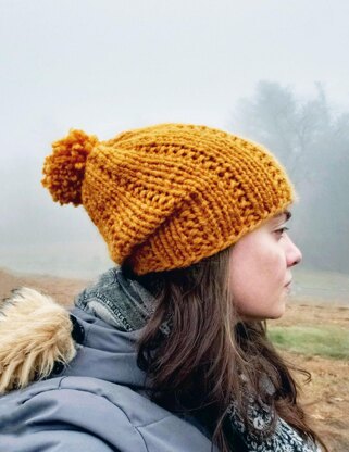 Materials• Double-pointed knitting needles, size 13 (9mm), set of 5 • 1 skein super bulky yarn (Lion Brand Thick & Quick, Mustard) • Stitch markers • 3-inch Pom-Pom Maker • Yarn needle