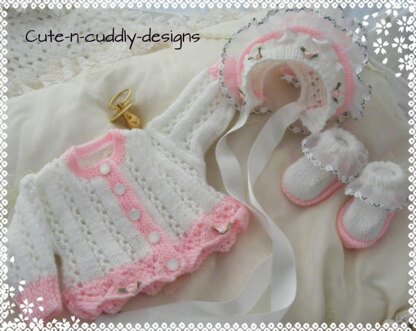 THIS PATTERN IS FOR A CARDIGAN , BONNET AND BOOTEES AND WHEN KNIT WILL FIT A REBORN 14-16 INCH OR PREM BABY UP TO APPROX 6LB