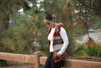 Vest worked in worsted weight (#4) yarn. Features inseam pockets, ruffled collar and bow details in back.