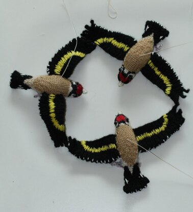 This pattern is to make a lifelike model of a goldfinch, a common and distinctive bird here in the UK. Goldfinches flock together, particularly in autumn when they often feed on the seeds of plants such as thistles or cornflowers. If disturbed, the whole flock, known as a charm, will rise up from the thistles and fly off in a mass of yellow.