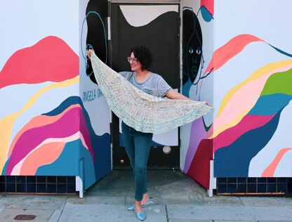 Yarn: MC: 435 yards of fingering weight yarn, CC: 87 yards each of 1 color of fingering weight yarn. Shown in The Black Squirrel (100% SW Merino). MC: Kiss My Glitz, CC: Neon Mint. Size: One size. 60 inch wingspan by 18 inch depth. Needles:US size 6/4mm. Notions: Scrap yarn, crochet hook, tapestry needle. Gauge:20 stitches by 40 rows in garter stitch on US size 6/4mm.