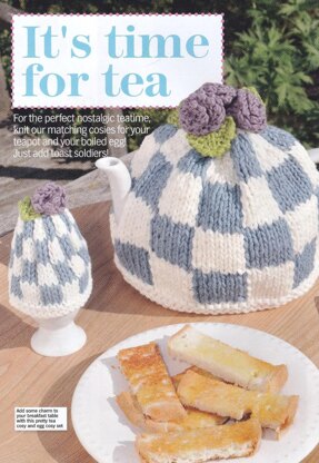 This is a pattern for a Check Tea Cosy, originally published in Knit Today. It has a vintage feel, in a simple checked fairisle pattern, shaped at the top, and a flower and leaves to decorate. There is a matching egg cosy. Photos Knit Today.