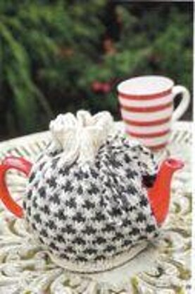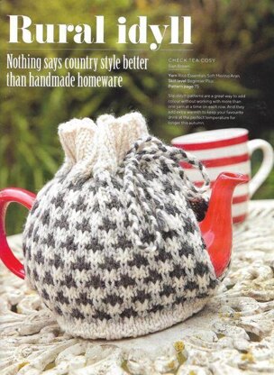 Checked tea cosy, originally published in Knitting magazine issue 236. It is knitted using a mosaic slip stitch in three colours, with 2 x 2 rib edgings, and eyelets and a tie to fasten. A beginner who can do slip stitch could do this. Photos Knitting magazine.