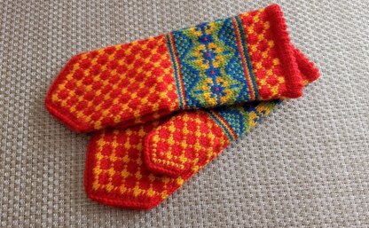 This pattern is for women’s size M mittens, with measurements approx. 9.5” – 10” (14 - 16cm) long from cuff to top, 4” (10.1cm) wide (or 8” (20.2cm) around), 5” (12.5cm) from the crook of thumb to end and a 2.75” (7cm) thumb. Your results of course will vary, as everybody has a different knitting style and tension, so always swatch first. Gauge to achieve: 15 sts / 16 rows = 2" or 2 cm