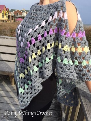 This poncho came about out of a desire to make something for my bonus granddaughter, Chelsea, who is thirteen. I made two baby blankets for her soon-to-be-born baby sister, and I wanted to incorporate the same colors in this poncho, but it had to be in a way that would be appealing to a teenager. This is a great companion piece to the blankets whether for a big sister or a mommy! It’s a super fast and easy pattern - easily adjustable for size and whatever colors you like. As written, the poncho measures 46” from top corner to top corner and 24” from neckline to bottom corner, but be aware that I crocheted this very, very loosely. You will need 1 skein of Lion Brand Pound of Love in Oxford Grey, 1 skein of Lion Brand Baby Soft in Petal, 1 skein of Lion Brand Baby Soft in Pansy, 1 skein of Lion Brand Baby Soft in Pastel Yellow, and 1 skein of Lion Brand Baby Soft in Mint. You will use very little of the Baby Soft colors so feel free to subsitute different colors.