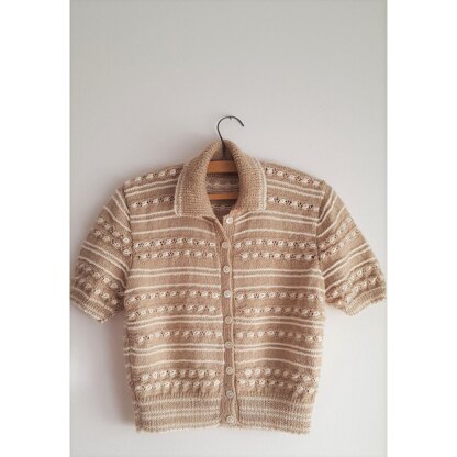 Pretty summer cardigan knitted in stocking stitch, with a simple, easy to work textured contrast stitch. The short sleeves and collar mean it can also be worn as a sporty top. The sample is knitted in a soft, luxurious 4ply wool & silk yarn. This design originally appeared in The Knitter Magazine, issue 126, summer 2018.