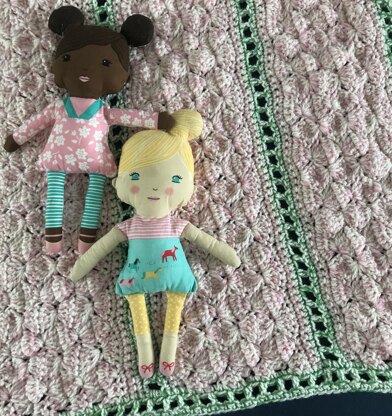 This is a beautiful blanket made using shell stitch which looks like cherry blossom. The two yarns held together give it a painterly quality. It is easy to make the repetition and rhythm of the stitches make it a relaxing make. The dolls in the picture are part of a set made using a panel designed by Stacy Iest Hsu for Moda Fabric.