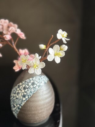 A miniature realistic version of a cherry blossom flower, made in Tunisian crochet. The total stem measures c.25cm (10in) in length for the large size and 13cm (5in) for the small. The petals are life-sized. Using a larger hook will produce a larger flower (see photos).
