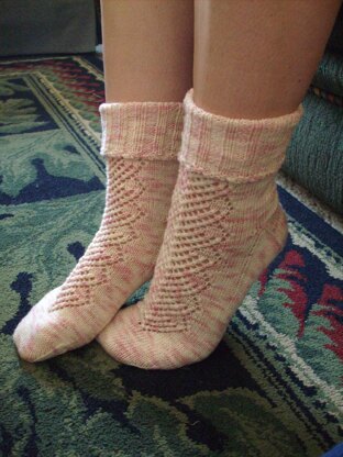Knit from cuff to toe with a Latvian Twist cuff edging and an easy to remember lace insert these are the perfect socks to start out s