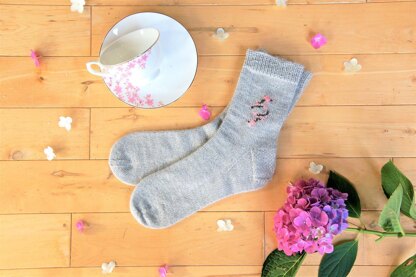 Cherry Blossoms is a cuff down sock pattern knit in a luxurious alpaca-silk-cashmere blend. A sweet cherry blossom design along the side of socks is created using duplicate stitches. This design was inspired by my first grown-up tea set.