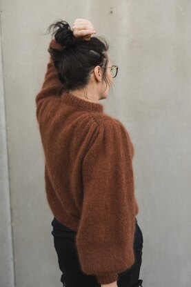 Chestnut sweater is a hip-length style knit. It has a short folded neck with a neckline. Long balloon sleeves are decorated with rib stitch cuffs. The main sweater focus is a shoulder line that has wrinkles in front, back, and sleeves parts. The sweater body part is worked straight to the hips so it is easy to customize your preferred length. This design was created based on the fashion of 80’s so it fits perfectly with clothes of that period style.