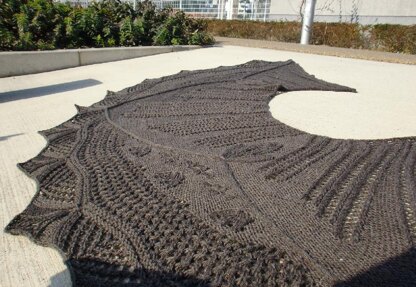 Inspired by the badges of Knightly orders, Chevalier is suited to the intermediate-to-advanced knitter. Cables, twists, smocked and embossed stitches give a richness of textural detail, while openwork rib, basketweave mesh, and traditional lace stitches give lightness as well as warmth. The unusual scooped-out half circle shape drapes prettily and stays comfortably on the wearer's shoulders.