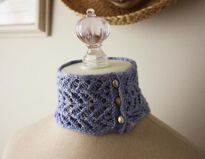 Chevrelle uses a beautiful lace design that makes the prettiest mesh pattern. A great challenge for intermediate knitters, with attached i-cord edging and a double decrease that may be new to some knitters that creates strong vertical lines. And the back of this lovely neck cuff is almost as lovely as the front!