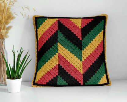 Herringbone Reggie Rasta Colors Pillow crochet pattern created with the mini Corner-to-Corner (C2C) crochet technique. Chevron layout in red, yellow, and green evokes reggae rhythms and cultural spirit. Ideal as a bold accent cushion, boho-inspired décor, or a vibrant handmade gift with Rastafarian flair.