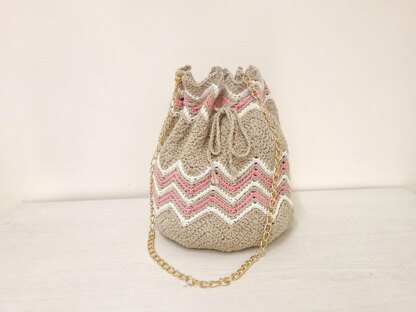 his bucket crochet bag was designed initially for I Like Crochet magazine for the Chevron Collection issue. I wanted the colors to be somewhat neutrals, so I chose jute as the main color and added light pink and white to add some color and interest into the bag. The pattern is worked in the round from the bottom to the top. At the top of the bag, we create eyelets to add a drawstring and a dainty metal strap is added to the bag (you can also use a fabric strap). The bag is comfortable and light, but big enough to carry all your essentials.