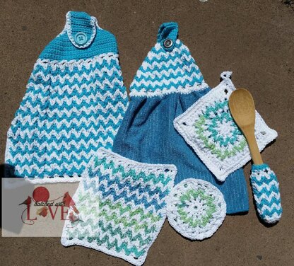 Instructions include: Dish Cloth Dish Scrubbie Pot Holder Full Hand Towel Towel Topper (worked on a regular towel) Cast Iron Pan Handle or Wooden Spoon Cozy