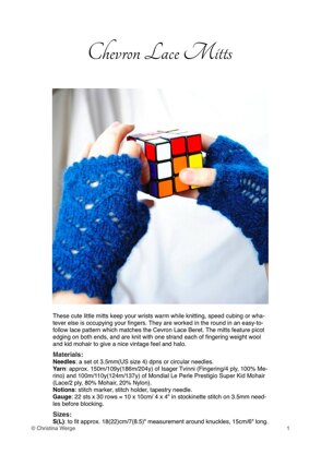 These cute little mitts keep your wrists warm while knitting, speed cubing or whatever else is occupying your fingers. They are worked in the round in an easy-to-follow lace pattern which matches the Cevron Lace Beret. The mitts feature picot edging on both ends, and are knit with one strand each of fingering weight wool and kid mohair to give a nice vintage feel and halo.