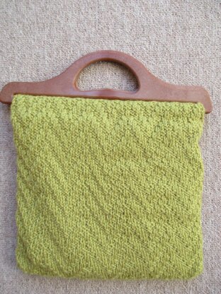 This is a pattern for a chevron project bag, originally published in Knitting magazine. It has a simple knit/purl chevron stitch, and is lined with fabric and wadding. The handles are wooden with a gap to pull the knitted piece through.