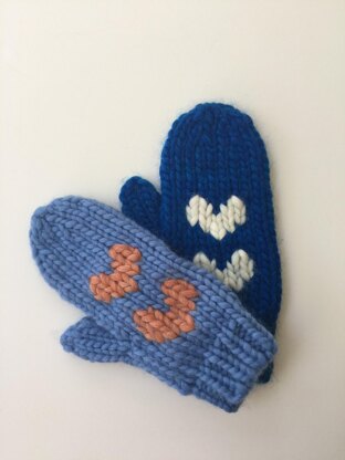 We designed these adorable mittens to remind us that love is all you need. They are knit in the round, or, if you're feeling feisty, try making them at the same time in magic loop. The double heart design on the front is made by duplicate stitch.