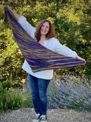 The shawl is knit side-to-side in garter stitch, using increases and decreases to produce the asymmetrical vortex shape that makes the stripes appear on the bias. There are both charts and written instructions for the lace sections.