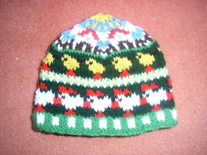 Who does not like farm life? Here I invite you to a trip to a chicken farm. It's a cute little kids beanie with a two color ribbing, hens and baby chicks all around and a farm barn and the sun at the top.
