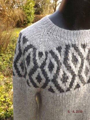 Chikane is a sweater/pullover worked from the bottom edge and up with a 2-colored pattern on the yoke. The sweater has a combined round and raglan yoke and sleeve construction. The body and sleeves are worked in rib. The pattern is made for at yarn with a gauge of 22 stitches per 10 centimeters (rib pattern) i.e. a yardage of approximate 90 meters per 50 grams. Pictured in Sandnes Peer Gynt.