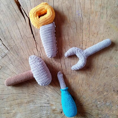 This is a crochet pattern to make 4 toy tool set: A hammer, a screwdriver, a wrench and a saw.