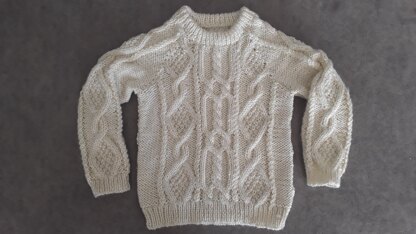 Two distinct cable patterns used, one repeated on the sleeves, all on a background of reverse stocking stitch.