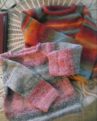 This style pullover, knit from the top down, will allow the knitter to “expand” the arms and body as the child grows if you so choose. As your child grows, you may make the sleeves and body longer simply by removing the bind off row and slipping the live stitches back onto the needle for further knitting! This pattern is written for 4 to 5 year size and size 6 to 7 years, using the same needle sizes but changing the weight of the yarn to obtain a different size.