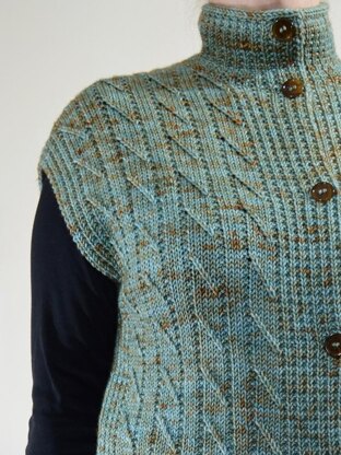 This comfortable, loose fitting tunic vest is the perfect extra layer for relaxing at home or walking in the crisp outdoor air. It features a fun and easy twist stitch pattern to add texture and is a great way to showcase a variegated or tonal yarn.