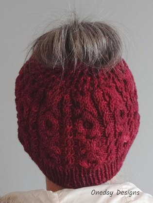 Chimenea is a circularly knit cabled “messy bun” and “pony tail hat”. It’s knit from brim to crown.