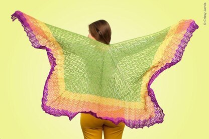 This three-quarter square shawl is worked from the centre out, beginning with a garter tab. Two garter tab options are included in the pattern: Turkish cast-on (my favourite) and the standard. One skein of main colour is worked in one stitch pattern, followed by five gradient mini-skeins worked in a second stitch pattern. Hard blocking is recommended as it opens up the lace and makes this pattern shine.