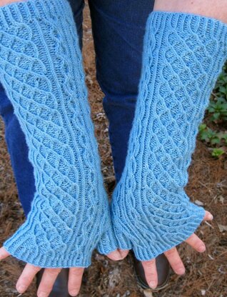 For “Cable-Lovers” everywhere, this is a great fingerless mitt pattern for you. There are two distinct cables in the mitt. Both of these cables are both unique and different from each other, and both come to us from Japan. If you love knitting cables, these long fingerless mitts will be fun for you to both make and wear and will allow you to text, type and knit in style and warmth. They do make wonderful gifts.