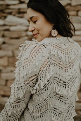 Chinook Winds is worked from the bottom up, in the round up to the armholes, then separated. The upper front and back are worked flat. Sleeves are knitted from the bottom up to maintain the lace pattern. The hem is worked in Twisted 1x1 Rib.