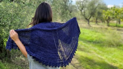 The inspiration for this design came from a poem written by the greatest Italian decadent poet, Giovanni Pascoli: ‘Il gelsomino notturno’, which translates as ‘The night-blooming jasmine’. In this poem Pascoli depicts a wedding night in a bucolic setting, describing the fragrance of the jasmine flowers that bloom at night and what he calls a ‘chirping of stars’ in the sky that turns the yard blue. Those two key elements, the flowers and the stars, were my main inspiration and are directly portrayed in the shawl: you can see the flowers in the vertical insertion that is the spine of the shawl and the beautiful allover lace pattern that represents the starry sky extending throughout the two triangular wedges.